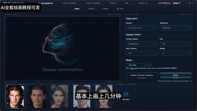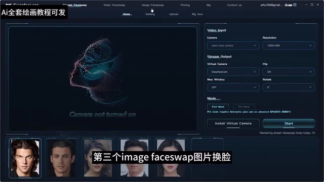 然后这边选择我们刚刚下载的虚拟摄像头,这里可以另开一个窗口,那这里呢调整摄像头窗口的角度,然后在下方选择相应的图片模型,也可以自己去上传一个相应的图片模型。整个操作呢也是相对比较简单的那整体这款软件操作呢是非常简单,基本上花上几分钟就可以完全的操作明白。不过这款软件它的免费版本是有限的,直播换脸功能的,视频换脸功能和图片换脸功能,每天都给我们提供十次使用的机会,对于我们普通用户差不多就足够了。它的收费版本的价格是非常昂贵的,你没必要去花这个钱。