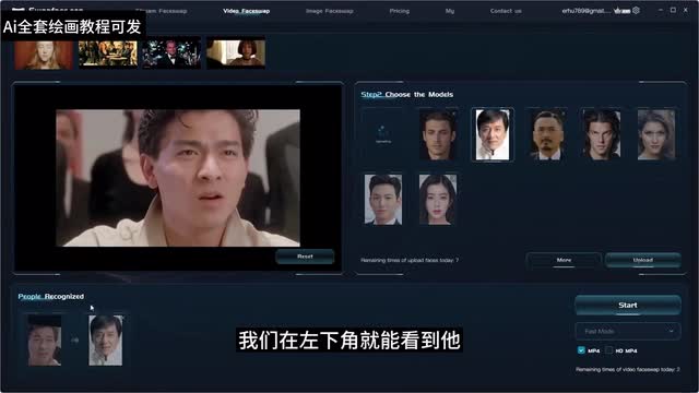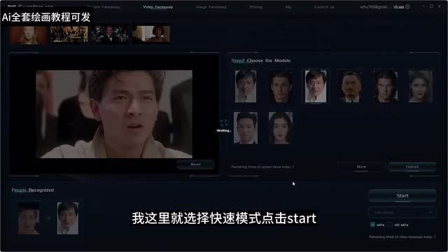 第二步我们需要上传一个模型,或者说选择系统自带的模型。系统给我们提供了五个自带的模型,我这里选择upload上传一个图片模型。这里上传一张成龙的照片,然后选择成龙,我们在左下角就能看到他这边会给我们提示是将刘德华的照片替换为成龙的照片。在点击start开始之前,这里有四种模式可供我们选择,有快速模式、专业模式、专家模式等等。