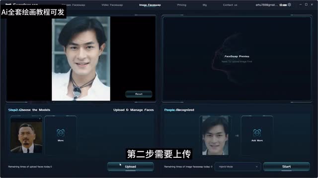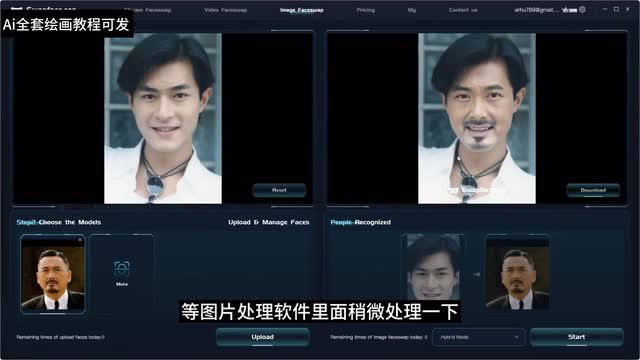 这种模式相对来说处理时间慢一点,但是效果也会更好一点。接下来我们来看它的image face swap图片换脸功能。图片换脸功能其实整个操作方法跟前面的视频操作方法是一样。我这里选择上传一张古天乐的图片,然后第二步需要上传一个图片模型,这里因为已经上传了,我选择周润发的上传模型,然后再点击ar之前他也提供了四个模式来供我们选择。