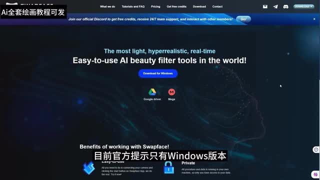 首先给大家接到s w a p p face这款软件只需要一张图片就可以替换视频里面的人物。我们首先来到swamp face的官网,目前官方提示只有windows版本。关于这个网站国内应该可以打开,但是到了它的下载界面,打开之后呢,下载速度非常慢。如果大家需要这个软件的安装包,可以点个一键三连,并在评论区留言。