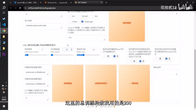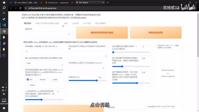 等待启动完成之后,这里会出现一个网址,我们点击一下。点击训练。输入实验名。采样率是四十八k。如果你要唱歌的话,这个音高指导一定要勾选上。
