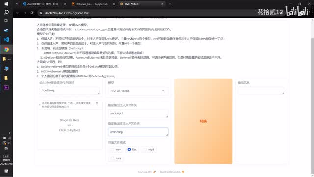 想要演唱的歌曲拖入。然后我们回到这个页面。在这里输入斜杠root。粘贴。注意一下,这里是文件夹路径,我们要删掉后面的文件名啊。