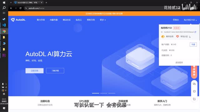 然后我们得到这些录音之后。来到这个网页,我会放在评论区或者简介。这边有一个学生认证,如果你有教育邮箱的话,可以认证一下,会有优惠。然后这边可以充值两块钱就够了。我们选择控制台的容器实例,点击租用新实例。