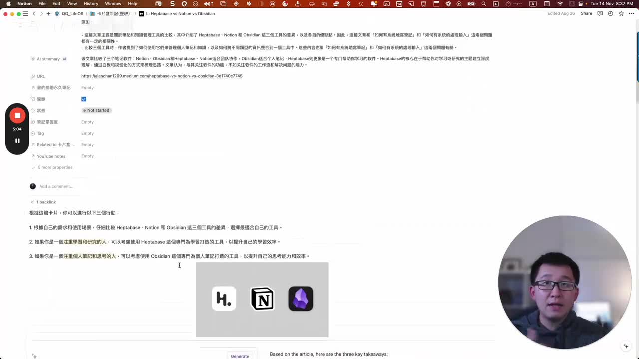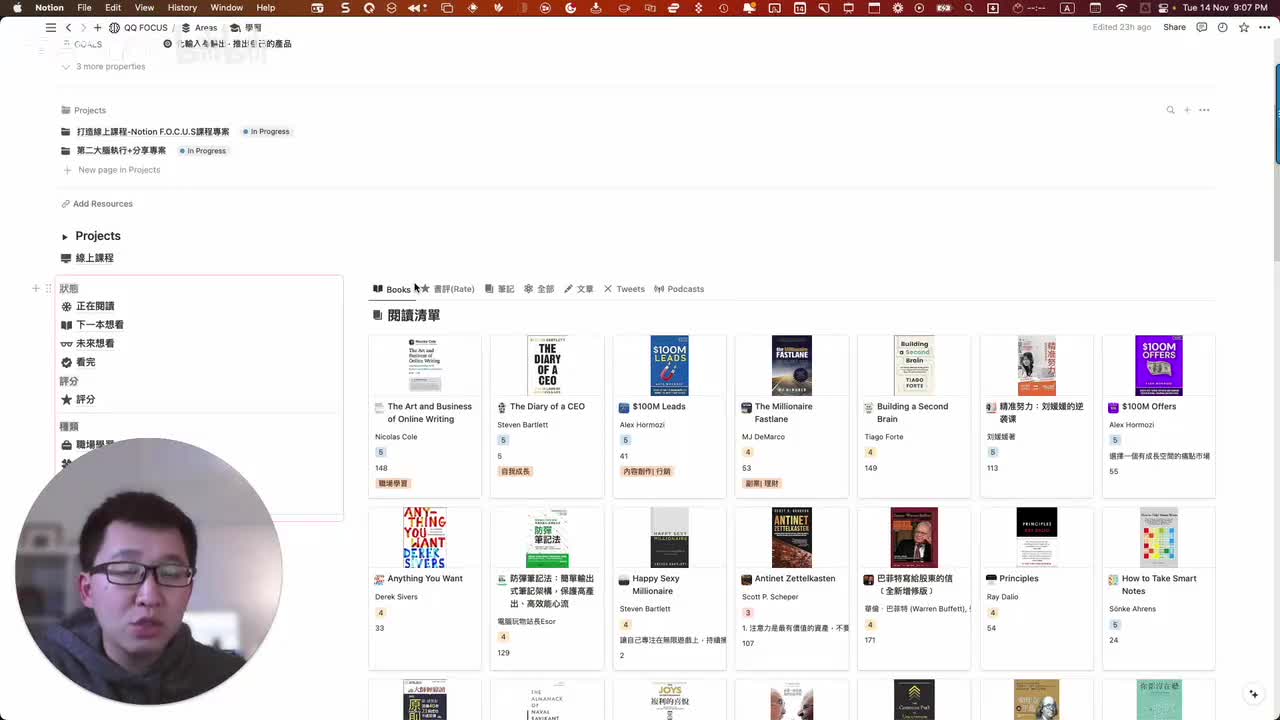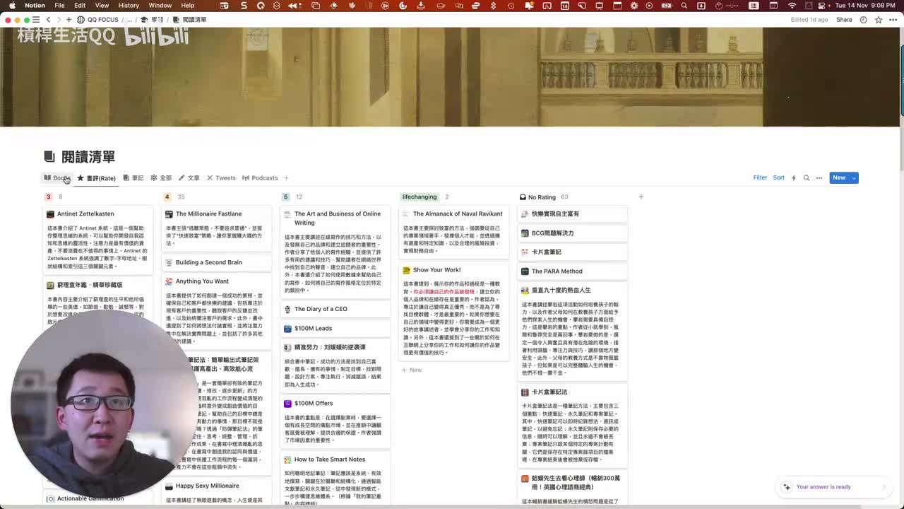 这样子我就可以直接去呃把我自己的一些阅读的一些想法,直接去做一个快速的总结。同时的话呢这个好处也会让我就是产生更大的一个动力去做一些看更多的书。因为我现在变成是我所有看的书啊,在我的这个。呃,notion页面里面都可以变成我的一个q n a的一个资料来源,就变得是非常的强大。那这个地方如果大家也有用这个read wise在之后的影片,我会跟大家介绍一下,我是怎么样把read wise的一个内容结合。