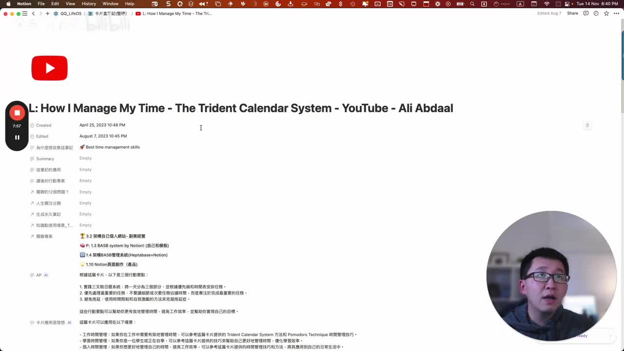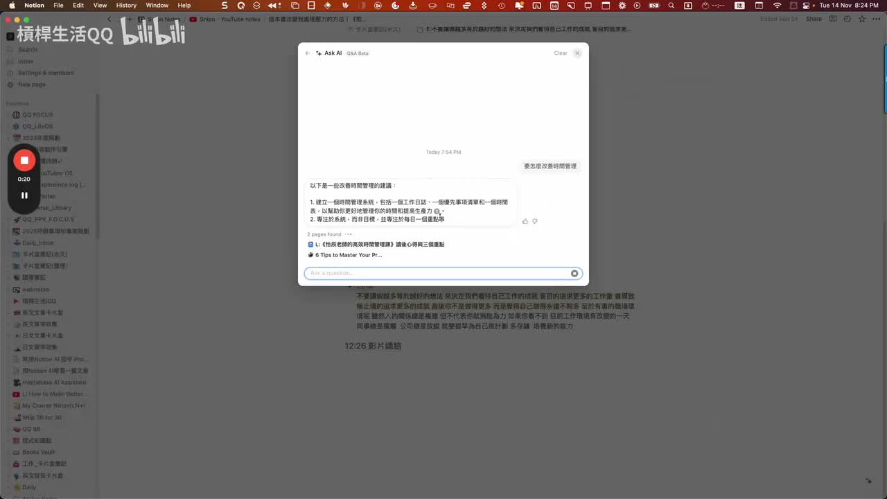 那我现在如果假设说我想要知道如何做好时间规划这个内容好了,我就按下面加p然后按呃搜寻这个x a i这个地方,然后按如何做好时间规划,他就开始去思考说如何做好。做好时间规划,那你看他就可以,他就收集到了我之前在做这个卡片和笔记本的这个整理里面所提到的这个呃阿里app o它的一个一个整理的一个方法。那在之前的影片有跟大家提到过,那这样子好处就变得非常大,因为变成是我之前所做的。所有的累积都变成我的一个notion的资料库。有点像是最近所提供到的,像是chap g p t,你可以去喂资料给他,然后客制化你自己的一个chap g p t。