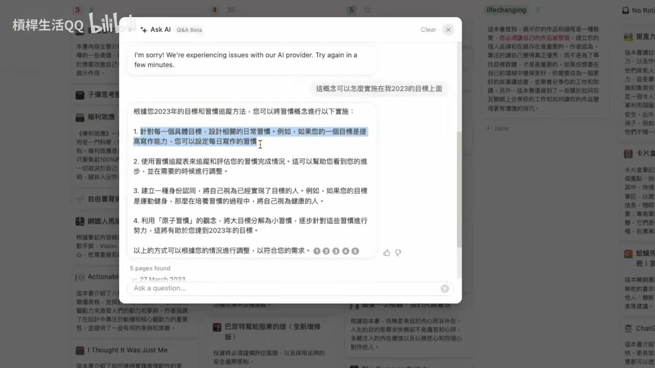 notion ai呢快速的总结说你想要知道的重点跟每一本书的内容的状态。那最后一点想跟大家分享的就是我发现这个notion q n a它还有一个地方是它可以去达到你可能平常不会去想到的一个笔记上面的链接。举例来说好了,我现在去查这个关于习惯嘛,那习惯我就想说呃这个习惯的这个概念。可以怎么样?去利用到我这个二零二三年的这个目标。那我可以问notion,那我可以看到他会怎么样的回答。