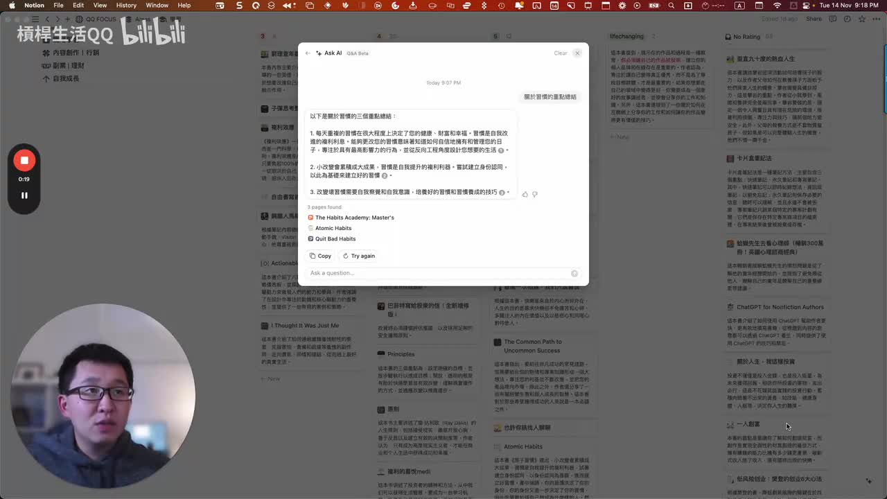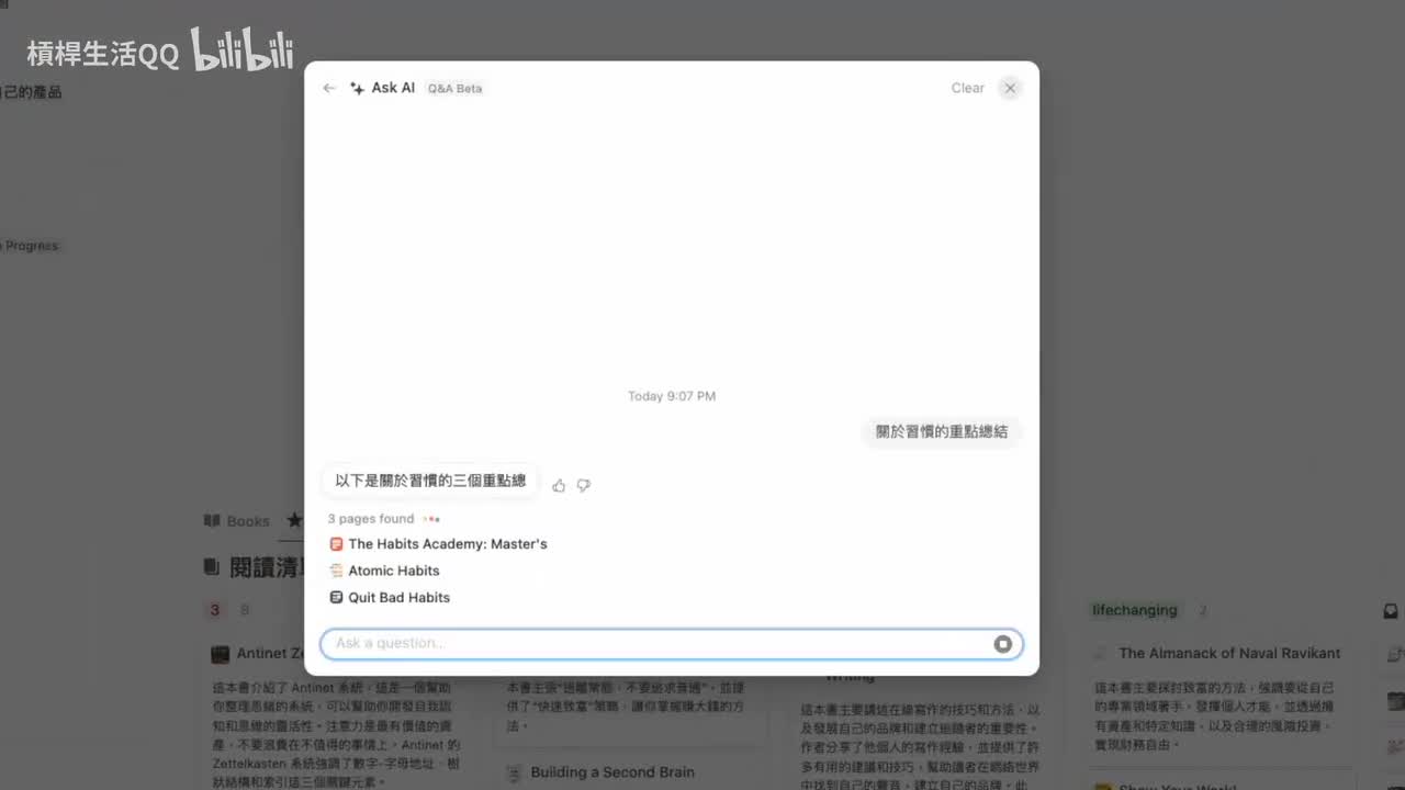然后你再结合你的notion ai,直接去总结出每一本书的重点内容。的话,那我们现在又多了一个新的功能,我们可以多了一个新的,我们利用这个notion ai的这个功能。那我可以去问,假设我现在想要知道关于习惯的重点总结好了,那我会预期他应该会找到我看这个原子习惯的一些的想法。那你看他就可以看到说他有查到我看这个原子习惯当时读的书,所画的重点内容,以及呢他有找到什么。他有找到我看这个文章,看这个文章所画的一些重点内容,基本上他找到了我很多想要看的一些的内容那。