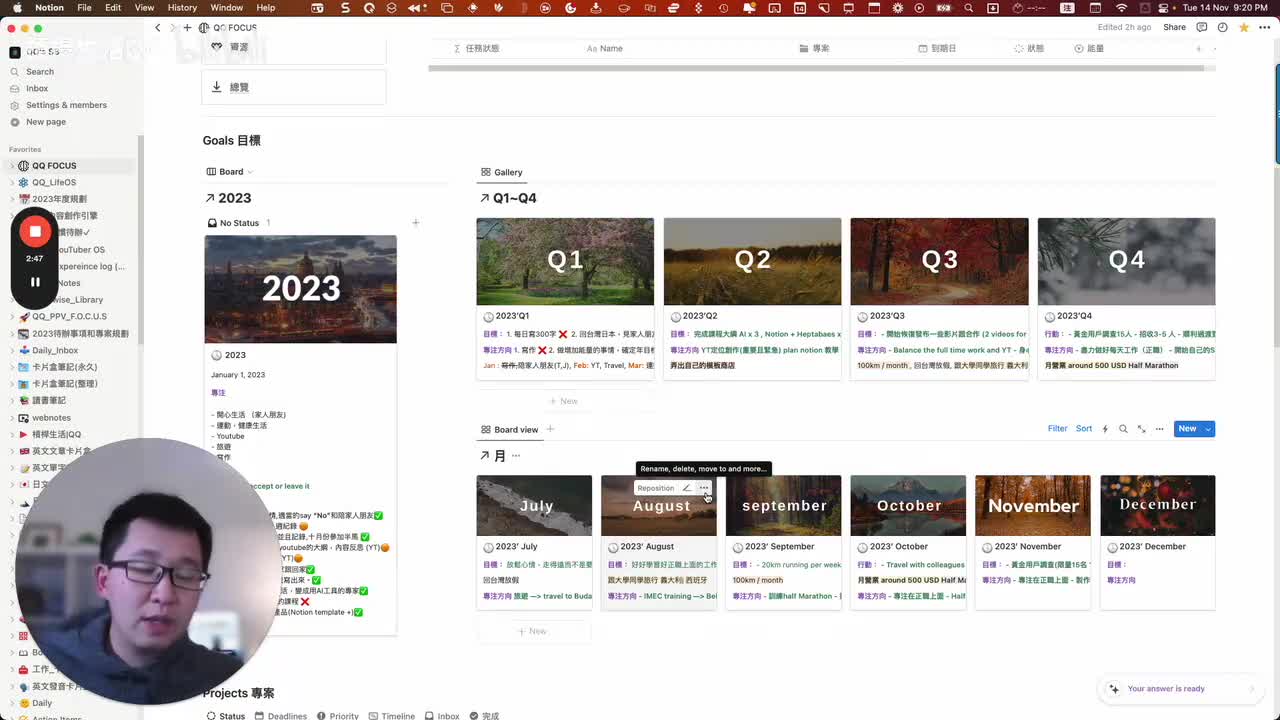 举例来说哈,如果现在点进去我的二零二三年的话,那你看它就会显示我二零二三年的页面。那实际上我当然可以每天就是去打开我这个notion的页面,然后去看一下我自己的二零二三年的目标,还有每个月的目标。那我可以去提醒自己。可是在notion q n a的地方的话呢,他就有办法帮我把我刚刚所查的习惯的这个想法去结合了我这个目标。然后告诉我说哎我现在读了这本书,然后这本书的概念可以怎么样的去运用到我现在正在实施的一些目标啊,或者是我正在实施的一些习惯上面。