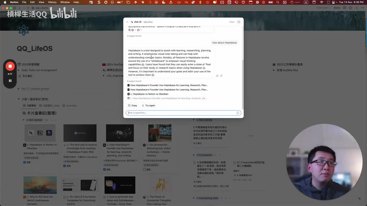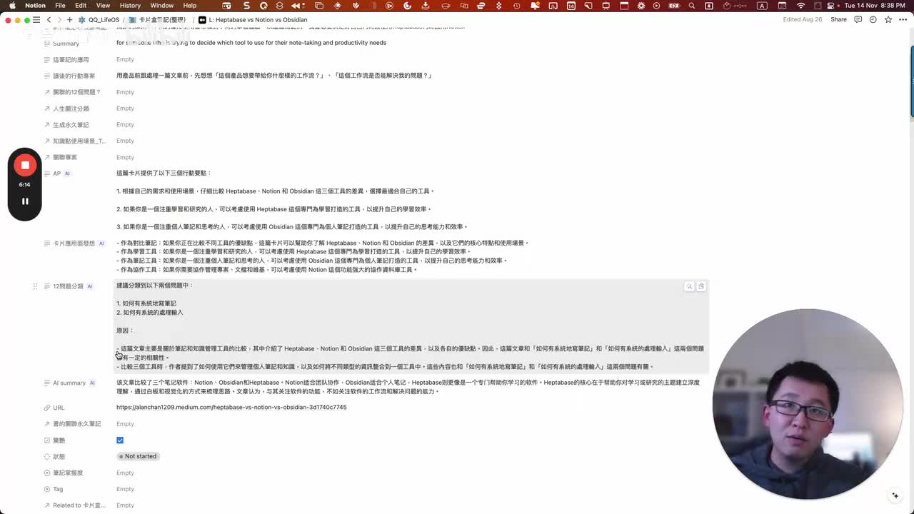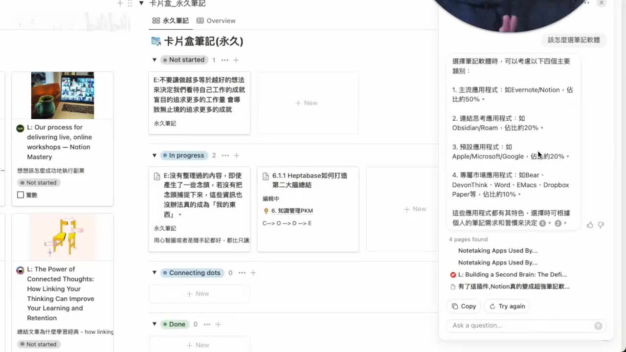 它都可以变成你现在的一些卡片和回答的方法。那这样子的话,第二他的回答内容会变得比较精准,像是根据你以前所学过的内容。第二个是你以前所学过的内容,你都可以按点进去一下,你就可以马上知道它的内容细节里面。这边有一个特别想跟大家介绍的是这个问答。它不单单只是会搜寻你这个notion页面里面的这个详细的内容,它连你在notion里面的这个property的内容,它都会一并搜索。