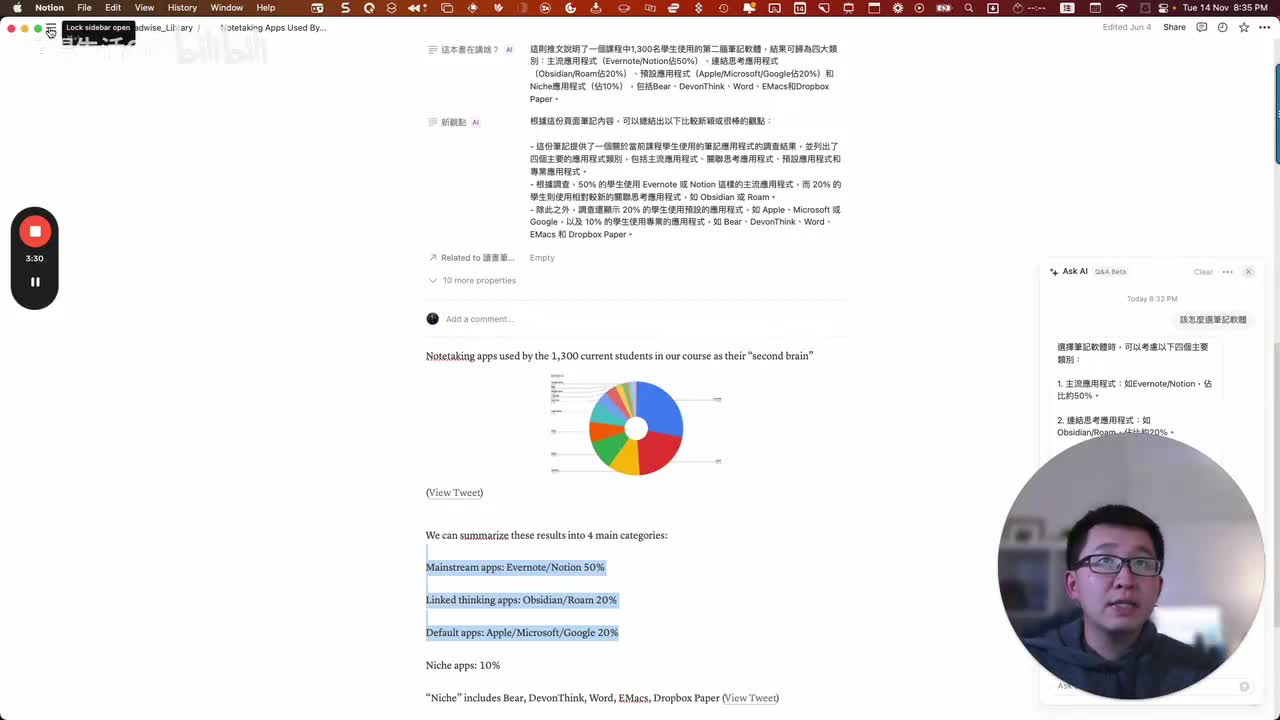 假设我现在想说就是该怎么样选笔记软件好了,那他就去根据我的一些所有的笔记内容去思考一下,那他就根据我这个问题去做一个回答。然后他这个回答的话呢,他就提到说evo note的notion的占比是百分之五十啊。然后再看之下,他这个跟chat g p t一样,它就是去整理出一些笔记内容。所以实际上我们就详细的去发现说它底下有提到这个四个配置我们所提供的那我点进去看之后,你就发现到这个是我之前从呃第二个四的twitter上面去查到了一个。资料那这资料也显示出就是我们这几个笔记的内容的百分比。