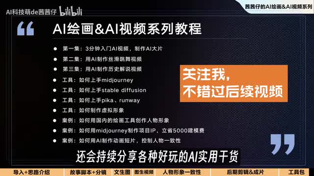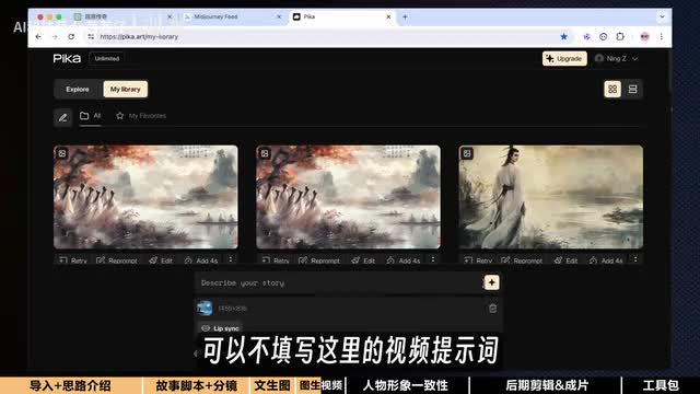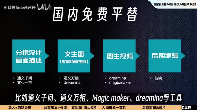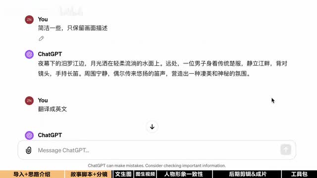 我们的核心原理仍然是使用对话式ai进行分镜设计和画面描述,利用图像生成工具,比如mid journey来创建相应的画面。使用视频生成工具将静态画面转化为动态视频,最后使用视频编辑软件增加旁白和特效。同时本期视频还提供了更多高级技巧,帮你进一步提升视频质量,在分秒之间变身为一个高级的内容创作者。