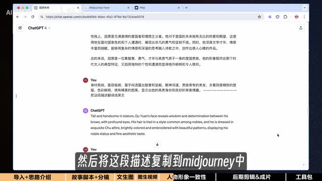 为了保障每个分镜中的屈原的形象一致,需要先确定好他的角色形象。我们通过x g p t描述屈原的形象,然后将这段描述复制到mid journey中生成图片。选定一个满意的形象用于后续的场景,接着按照同样的方法生成第二个分镜的画面。