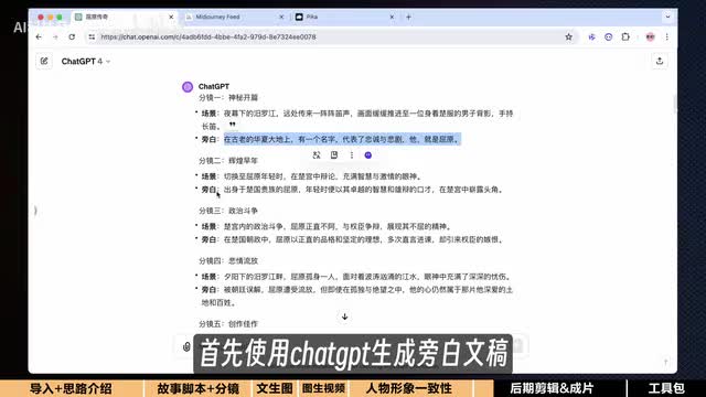 接下来以这个历史人物解说屈原人物传为例。首先我们将使用叉g p t来生成分镜设计和画面描述。具体的提示词为以屈原人物解说为主题写一个具有传奇色彩和反差感的人物传记故事脚本,一共涵盖十个分镜。