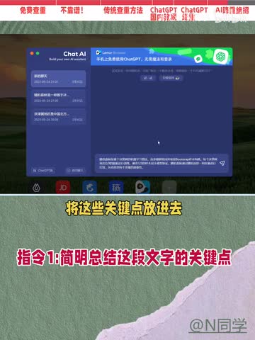 在chat g p t中将你重复的段落放进去加上指令,简明总结这段文字的关键点。然后在劝g p t中打开一个新的窗口,将这些关键点放进去加上指令。将这些关键点进行扩写之后,chat g p t就会给你改头换面的段落,用这一招肯定能把重复率给降下来。
