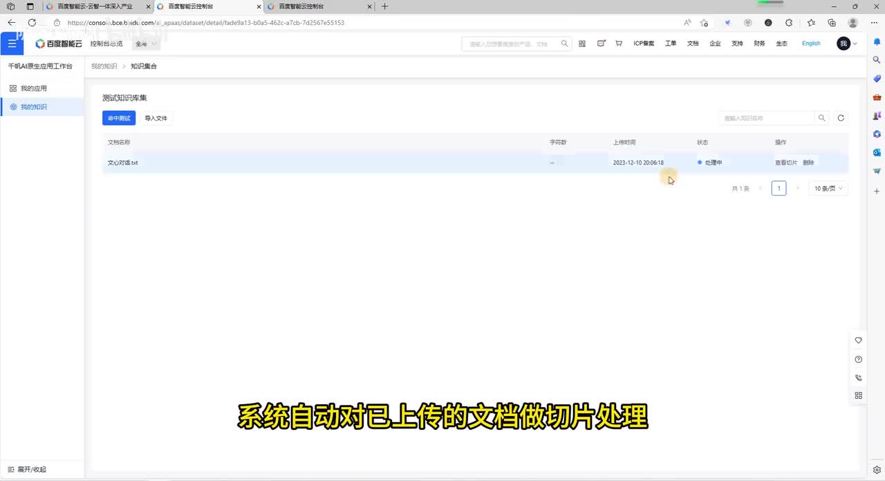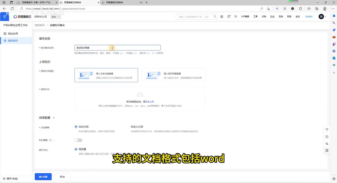 创建一个新的知识集合,就可以根据自己的需要导入知识库文档。目前百度智能云的知识库功能可支持的文档格式包括word text以及p d f格式。上传文档之后,后台将自动对上传的知识库内容做切片处理。