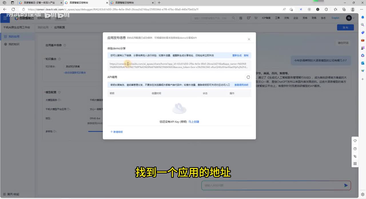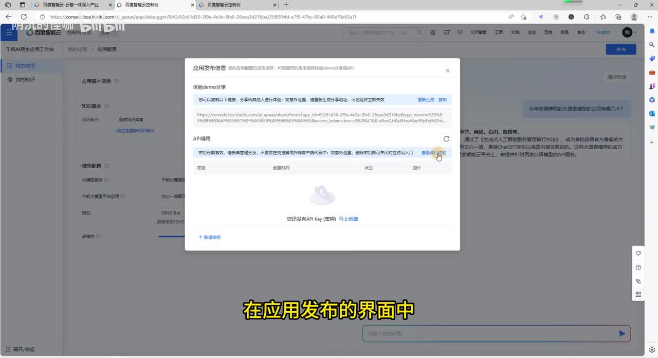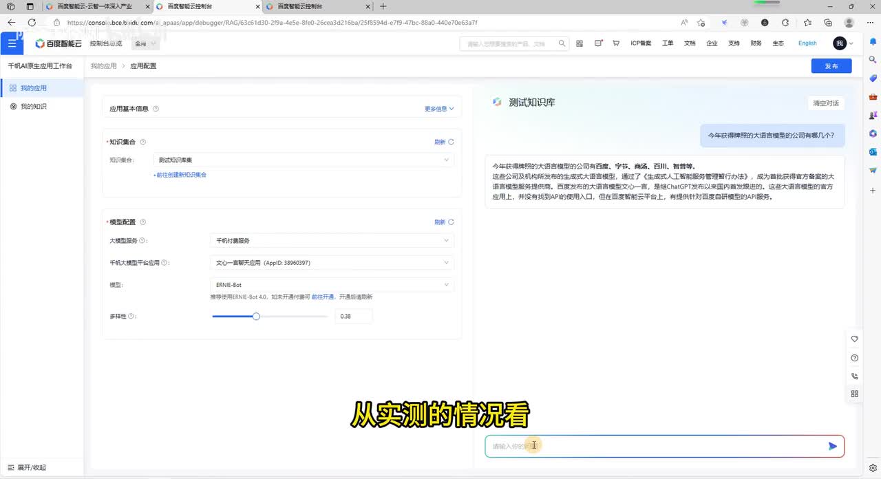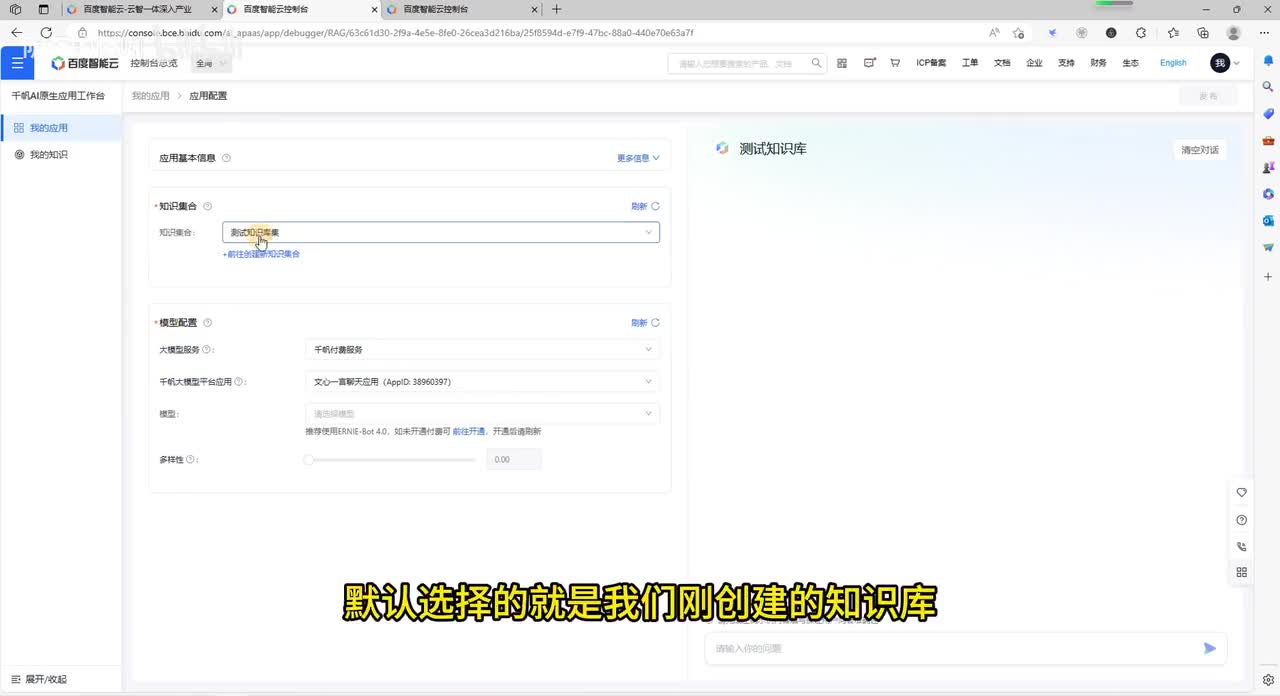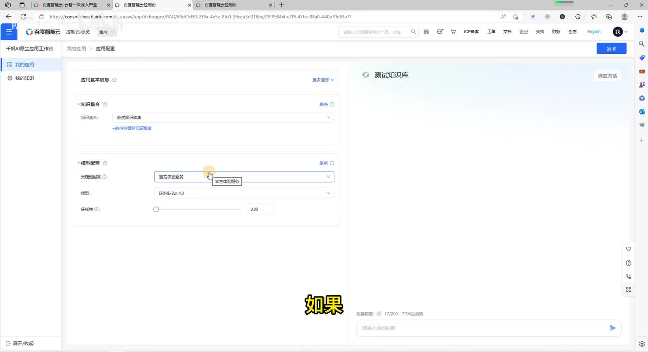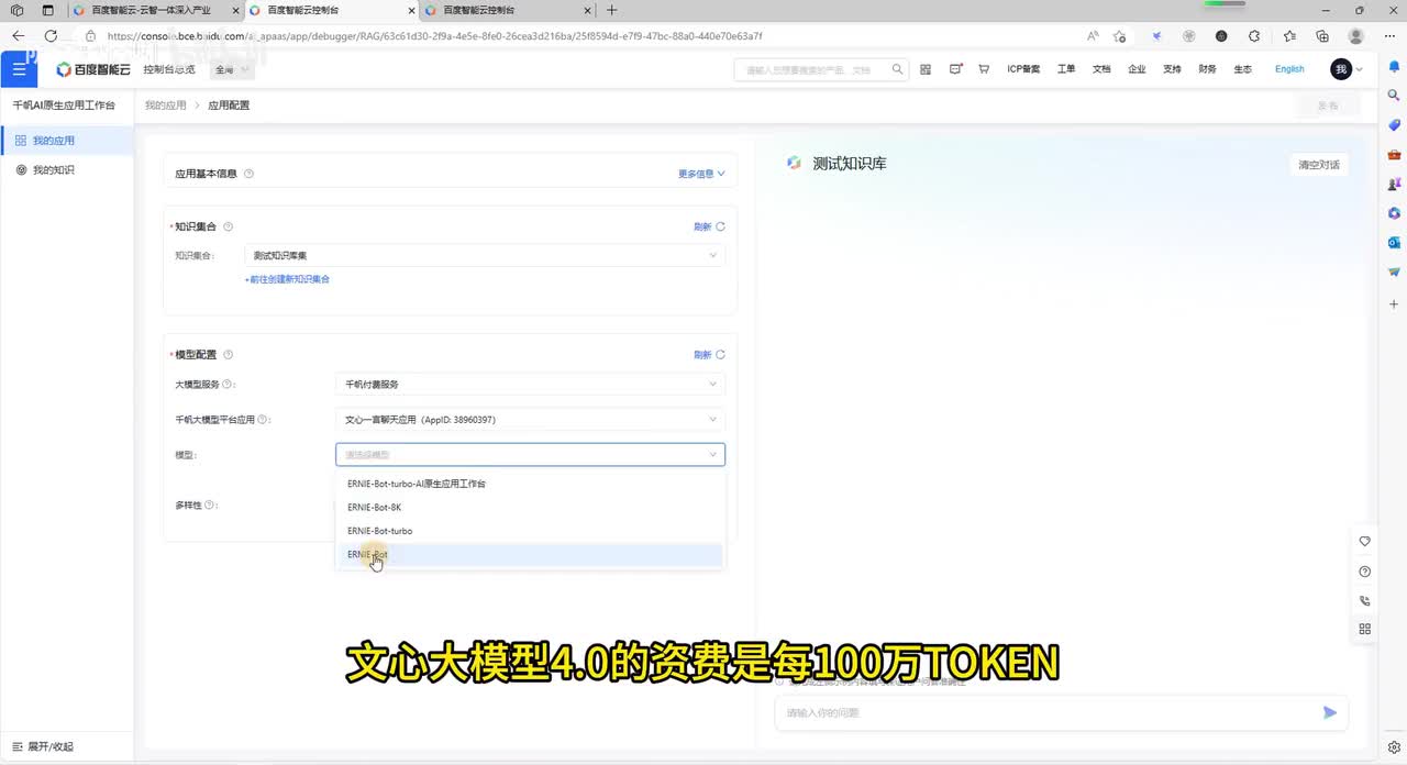 在模型的选择上,我还没开通文心四点零的模型,所以先使用老版本的模型吧。这里大家可以注意一下,文心大模型四点零的资费是每一百万token付费一百二十元,大家根据自己的情况选用吧。设置完成之后,我们可以在应用配置界面预览知识库应用的效果。