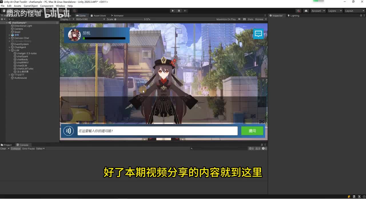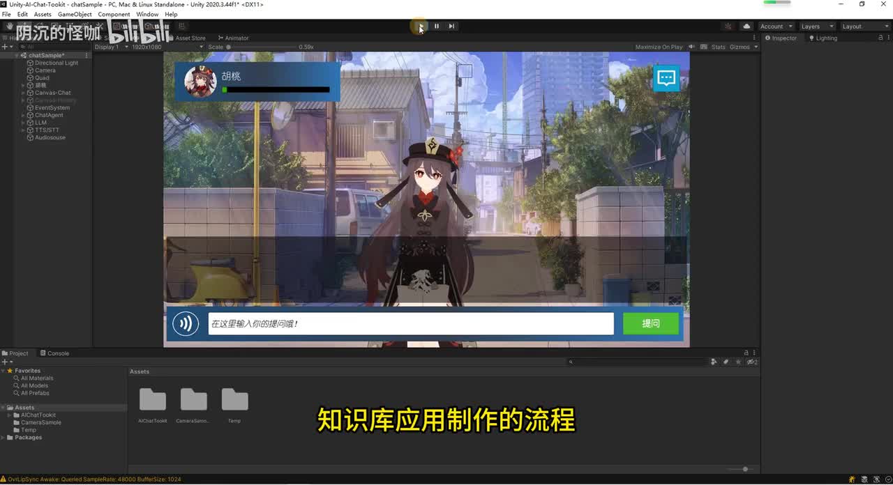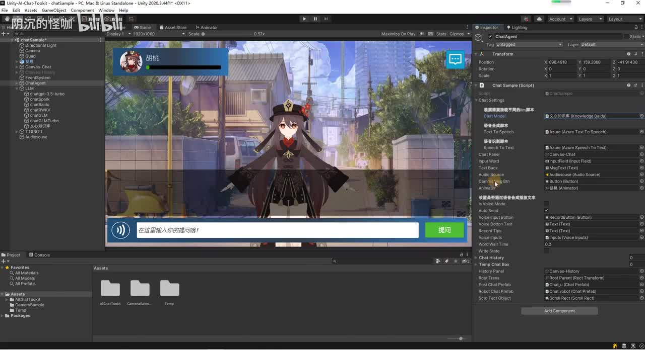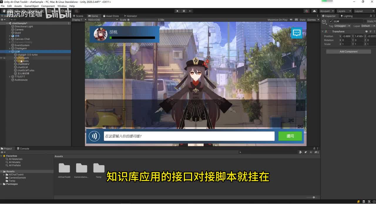接下来在unity中导入a i小姐姐工具包,要求unity版本在二零二零点三点四四及以上。我们可以在l l m对象下找到文心知识库对象,知识库应用的接口对接脚本就挂在在这个对象上。我们可以在检视界面上找到a p i p的变量输入框,把我们刚才创建的a p i p填写到这个参数中即可。