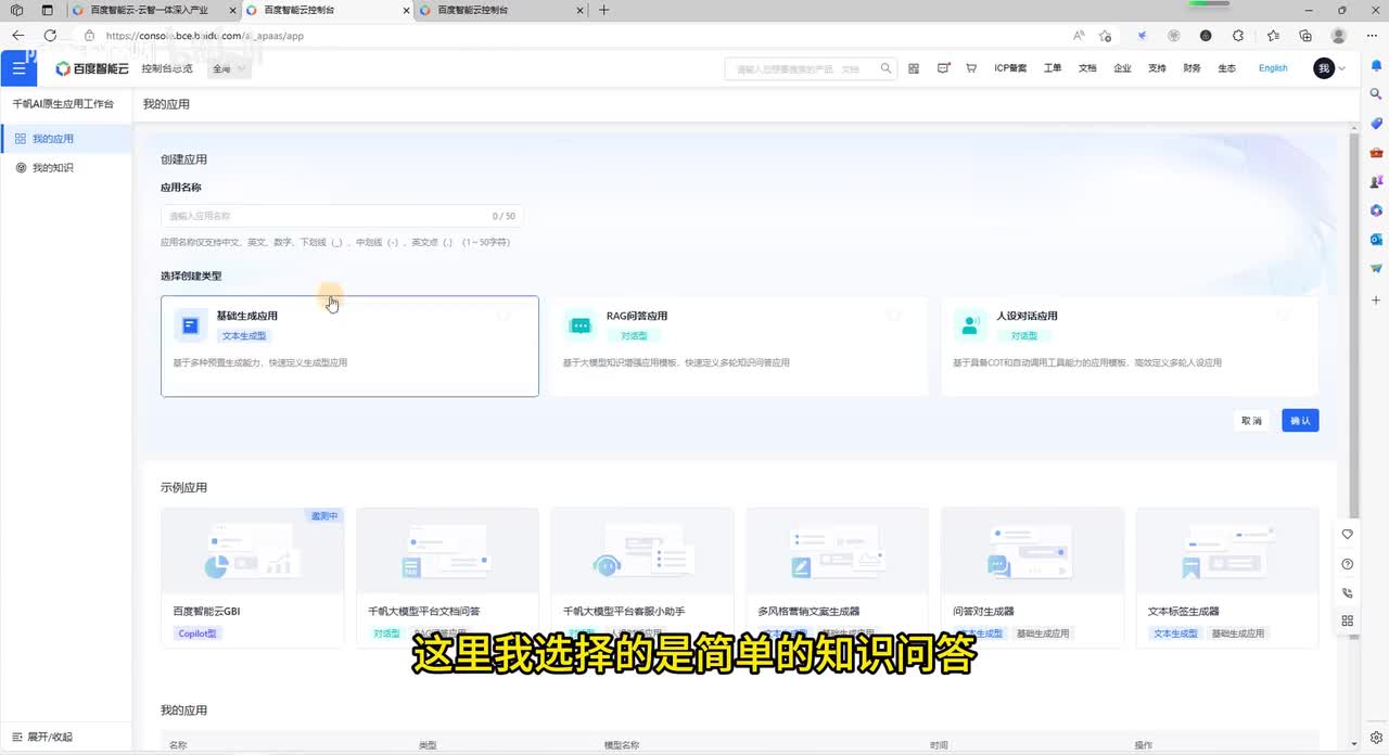 千帆大模型超级工厂找到千帆a i原生应用工作台的菜单。我们就可以在菜单中找到知识库相关的应用入口了。点击问答应用,进入到知识库应用工作台界面。
