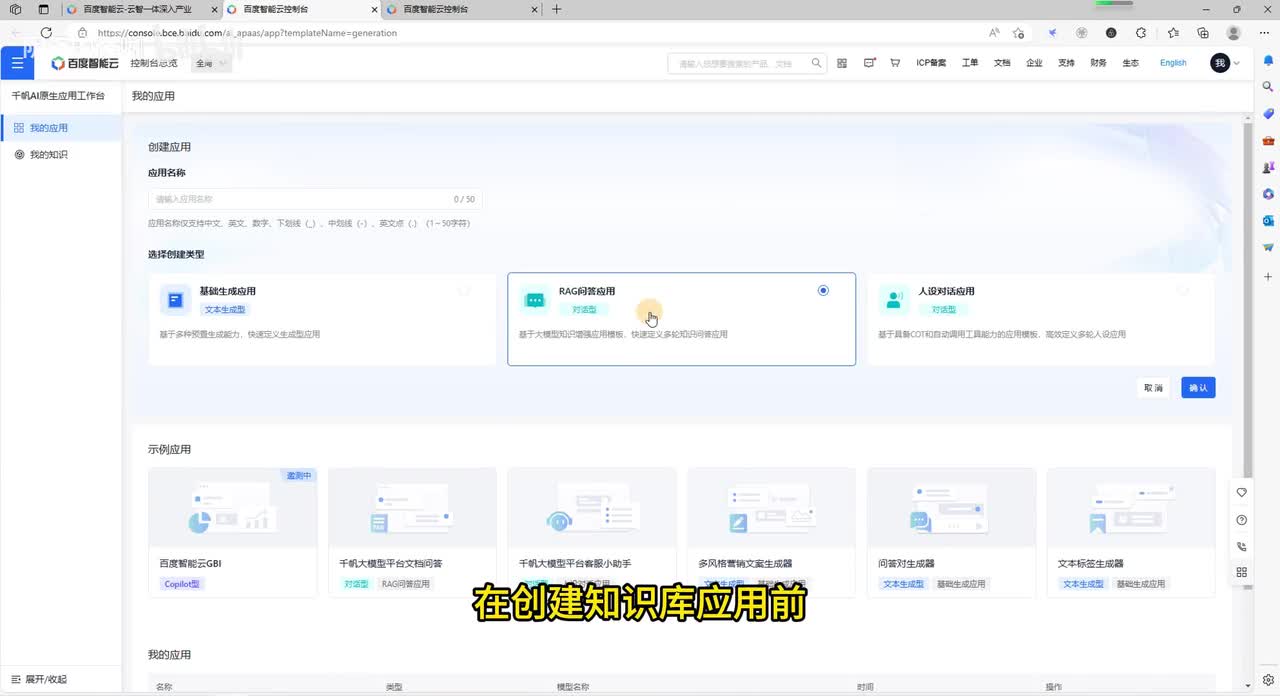 在应用创建页面下,我们可以发现百度智能云提供了三种不同的应用模板,可以辅助我们构建基于知识库的a i应用。在创建知识库应用前,我们首先需要上传一些自己的知识库文档。可以在控制台的左侧找到我的知识入口,点击即可进入知识库创建页面了。
