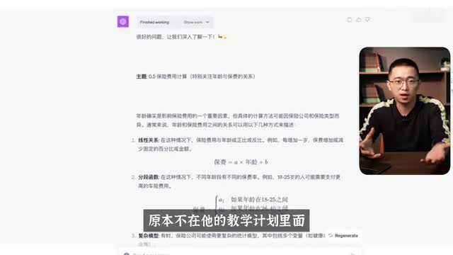 的时候,我询问到不同的年龄到底应该怎么计算保费,这些都是我自己的问题。我就问他的时候,因为这个东西原本不在他的教学计划里面。比亚迪我单独开了一个新的章节给我,他就改变了他的教学大纲。这个再次验证了这是一个多么强大的个性化的教学工具,真的太太太太厉害了。
