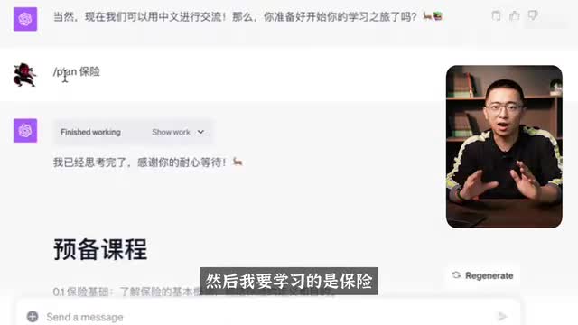 所以我们进入到第二个部分,就是新领域的学习应该去怎么用。那因为这是新的领域嘛,所以那刚才我们用的是小红书,所以我重新开启了一个新的对话。然后我们学习的是保险,所以我输入plan保险,那这个时候就开始。那给我了一个预备课程的教学计划,还有主要课程的教学大纲。