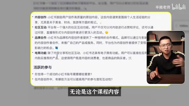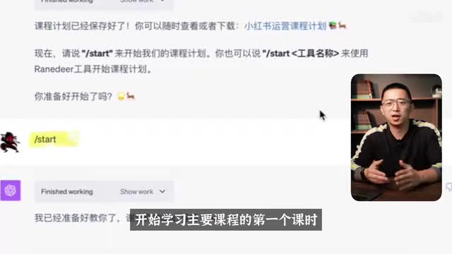 其实整个逻辑也差不多。所以我觉得这这这个教学大纲的部分它表现还是不错的那接下来我们可以开始进入学习的过程,那你输入star零点一就可以开始预备课程的第一个课时,或者你可以直接输入斜杠star就可以开始学习主要课程的第一个课时。那a i跟我简单介绍了这个小红书的平台,而且它最后还留了一个思考题给我。问我说你觉得小红书为什么能够吸引到这么多的用户?有没有什么其他的因素你觉得很重要呢?我简单回答一下。