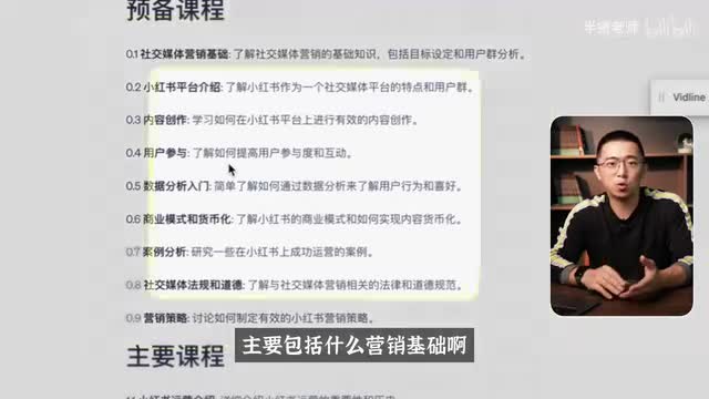 那每个预备课程还有主要课程都是九课时。那我觉得九个课时作为一个章节,其实这种设计学习压力确实控制的蛮好的,就也不压力太大。那课程内容你看一下主要包括什么营销基础啊,平台的介绍啊,内容的创作啊,怎么去提升用户的互动量,数据分析还有案例。那当然你可以对比一下这个a i生成的课程大纲,跟我自己现在做的小红书的课程呢对比一下。