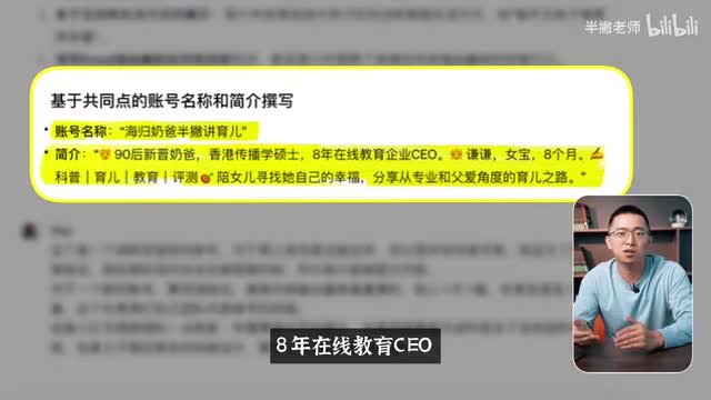 我们来看一下,比如说这个账号名称,他都提及到说哎这些账号名称都有,还有家庭角色,都非常的亲切接地气对吧?还有关于这些账号的简介,他都提及到说这些简介都展现了个人的背景,还有专业性,同时还有emergent来增加趣味性。那可能因为有了更好的参考案例,还有数据源g d p在这个版本当中给的名称和简介我都比较满意了。他把名称叫做海龟奶爸半截桨育儿,把简介啊九零后新晋奶爸啊,什么传播学的硕士,八年在线交流c e o啊,包括宝宝的名称、月龄,还有我的选题,比如包括科普育儿教育评测,然后啊一个陪女儿寻找他自己的幸福,分享从父亲角度的育儿之路。哎,我也觉得他帮我找到那个从父亲的角度,这些都是他自己找出来的那关于名称这个虽然海归这个词我有点反感啊,但是看到这个结果其实还是很震惊的。因为a i可以从我我那个自定义的配置当中,还有我的参考列表当中,提炼出这个坡有小红书味道的名称,还有简介。