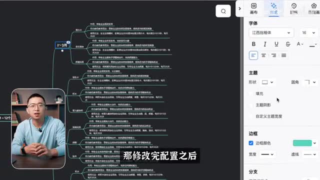 那有了这个导图之后,其实在软件当中你还可以做很多自定义的配置。那比如说我自己就修改了配色,你可以调整成深色模式。你可以对字体比较小,可以调大,你可以调整成我自己比较喜欢的江西佐卡的一个字体。那修改完配置之后,导出图片就可以做截图的发布,这个就是客户的效果。那意图呢我觉得自己无论对于做号还是说做日常的思维导图,我觉得都是值得重复,自己也是会员之一。