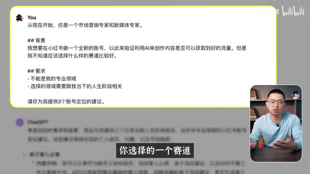 所以我a i说从现在开始,你是一个市场营销的专家和新领域的专家。我想要在小红书做一个全新的账号,用此来验证说利用ai来创作内容是不是可以获取到好的流量。但是我不知道应该选择什么样的赛道比较好。那我给他要求说,你选择的一个赛道不能是我的专业领域,还有告诉他说你选择的这个领域需要跟我单价的这个人生阶段相关,那让他为我提供一个账号定位的建议那。a i给了我三个赛道的建议,分别是亲子育儿、个人成长的时间管理,还有旅行,还有文化探索。