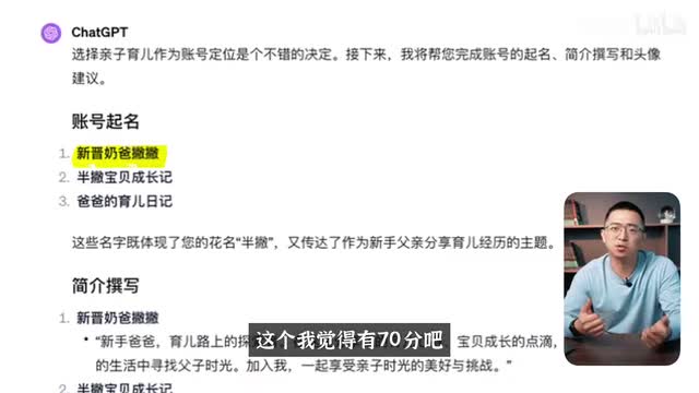 那我之所以没有给出很长的像我之前的一样的结构化的指令,是因为通过不断的跟ai对话还有反馈,我目的是为了让g t p来熟悉整个主题,有一个比较成熟的思维链条。那在g t p的首次回答当中呢,他给我的账号名称叫新晋奶爸撇撇这个我觉得有七十分吧。那撇撇这个字感觉好像太可爱了,对半撇可能会更好一点。那另外我觉得也少了一些权威性,那简介的部分我觉得有六十分,我让他少了那种小红书imaging的那种味道。那头像的部分他说选择一张跟您的宝宝合影,特别是那些比较温馨自然的瞬间,能够传达亲子的主题,我觉得这个满分。