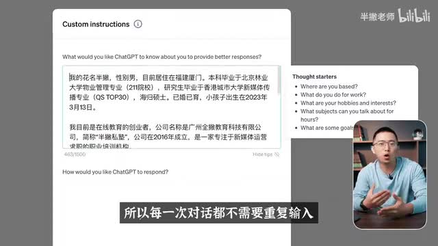 到这里你可能会问说为什么我啥都没有说,但是他就是知道我是一个新手宝妈,为什么知道说我每年会有旅行的计划呢?那这个其实就是我提前把我自己的背景相关的信息,通过g t p当中的一个自定义的指令叫customer structure,提前喂给了g t p。所以每一次对话都不需要重复输入关于我自己的信息。那我在之前的视频当中也有详细的关于这个功能的介绍,还有怎么样配置的指南,大家可以到我的主页当中去查看就可以了。那另外我自己也有原创的a i引擎prom指令设计的绿皮书。那这本电子书呢包括这个指令的写作框架,还有技巧。