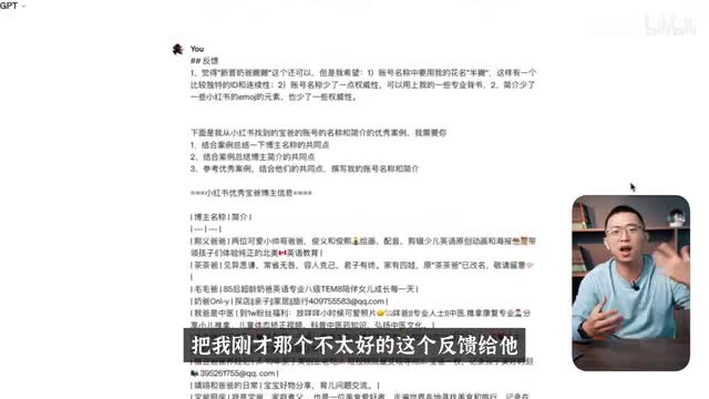 好,那因为g d p里面肯定没有小红书当前宝爸这种账号的数据库,要让他有更好的结果,需要把一些优秀的账号的数据喂给他。所以我自己用爬虫装了一百多个小红书,母婴赛道当中这个名称带有霸这个关键词啊,这些账号的名称,还有简介的列表。那接着呢我在g t p当中把我刚才那个不太好的这个反馈给他,还有把整个账号的列表都输给他,让他先总结然后再优化。为什么先总结再优化呢?是因为我同样要给a i的学习的过程。那有了这些参考的数据以后,我发现第二次的输出当中呢,g d p对这些博主列表进行分析,给出的这些名称还有简介的共性,我觉得它洞察是非常好的。