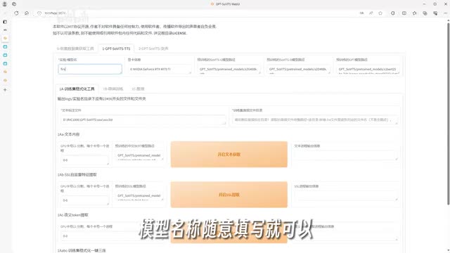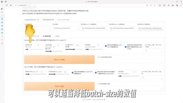 训练完成之后会有提示信息,然后再切换到e b杠微调训练的页面参数一般保持默认即可。如果你的显卡选择小的话可以。适当降低batch state的数值,然后点击开启这两项训练就o k了。成功之后右侧会有提示,在g p t v s和swifts这两个文件夹里就可以看到训练好的模型了。