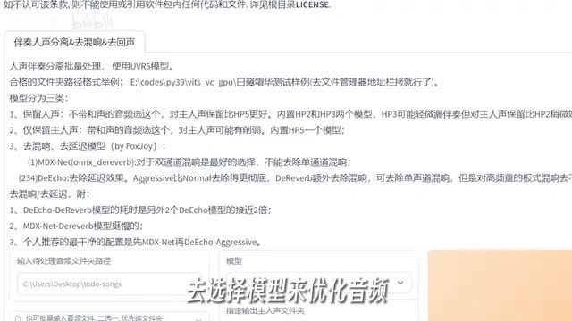 如果有背景音乐之类的杂音,可以先勾选上u v r五的选项,会自动打开一个新的页面,把需要处理的音频上传上去。大家可以根据说明并结合音频的情况去选择模型来优化音频。大部分的音频选择第一个模型就可以,选择好了之后点击转换就o k了。等输出信息这里有了提示,就可以在输出目录找到已经处理好的音频文件了。