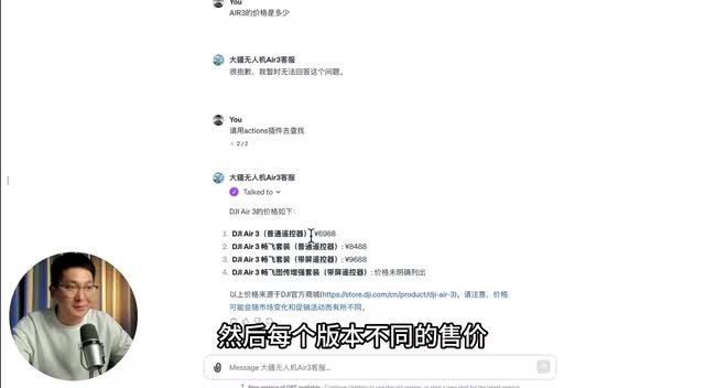 因为在我采集下来的数据里面啊,它是不包含这个l三的数据的啊。我们先来问一下,他告诉我们很抱歉我暂时无法找到这个答案啊啊他这个是遵从了这个g p s的partner说明的设定啊。o k好,接下来神奇的诗歌来了啊,我让他去用a l s的插件啊去查找这个价格啊,答案已经出来了啊,他告诉我们。这个a二三是有四个版本啊,然后每个版本不同的售价都告诉我们了。啊,可以看到他这个执行的过程,它是通过这个action去查找大疆l三的价格,啊,然后得到这个结果。这个页面的内容来源呢是通过这个网址啊,我们可以点开看一下o k啊,下面是对应的是l三啊l三颤飞套装啊。颤飞套装带遥控器屏幕的有三个版本,六九八八八、四八八九六八八啊、六九八八八、十八八九六八八都对的。