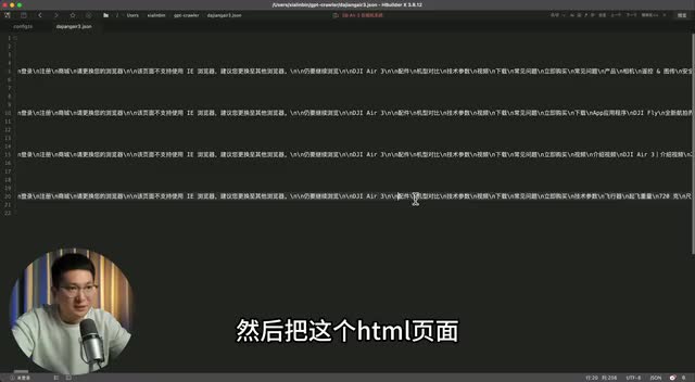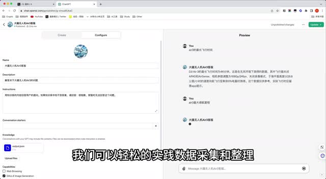 现在呢我是找了一个大疆的官网啊,就是关于这个a l三这款无人机的一个产品主页啊。首先是不同的菜单栏,那现在呢我就用刚开始视频开头所讲的这个小工具啊,把它的这个a二三所有的站点信息里面的一些页面数据都给它采集下来了。它是这样的一个数据结构啊,首先是页面的标题,然后页面的链接以及这个页面当中的网页内容啊,可以看到目前总共是采集的四个界面,常见问题、下载视频技术参数对应的是这几个界面。我们就以这个技术参数这个页面为例啊,我这里比把它切换到技术参数啊,然后在这里就。去看一下它采集下来的内容是什么呢?啊,它是一个jason的格式啊,然后把这个h t m l页面所有的文本内容啊都给它采集下来啊,可以从这里开始看啊。技术参数,飞行器啊起飞重量七百二十克,折叠长二百零七毫米,宽一百点零五毫米啊,跟这个数据其实都是对应的上的啊。接下来呢我们来打开chat g p t的界面啊,我这边已经创建了一个大疆无人机l三的客服啊,后续呢我就会用刚刚我所采集下来的这个a l三的加深格式的页面文档啊,然后结合g t s的知识库啊,把它打造成为一款a二三的客服系统啊啊我们先来看一下这个g t s的基本设置啊名字,然后这边是描述啊,包括我这个partner说明也非常的简单啊,就是要求他用知识库内容来回答用户的问题。