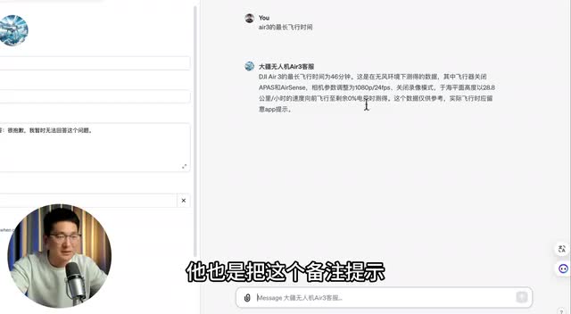如果知识库找不到答案,那么就回答,很抱歉,我暂时无法回答这个问题啊。在知识库这里呢就是把刚才我们。所看到的这个接收文件啊给它上传上去了。这里呢为了测试严谨一点啊,我们把这个联网功能给它关闭啊,免得大家误以为是通过联网去查询啊我们后面所要提的问题啊,现在呢我问他第一个问题啊,我们的l三的最大飞行时间啊是多久?o k啊答案已经出来了啊,大家说最长飞行时间是是四十分钟啊啊我们来对比一下这个参数里面的答案啊,最大飞行时间是四十二分钟啊,并且在无风情况下啊,下面有一个备注注问题啊,在这个答案当中呢,他也是把这个备注提示啊,我我回答一下啊啊我们再来问第二个问题啊,l三的最大续航里程是多久?答案显示的是三十二公里啊,这个我们也来确定一下啊,o k最大续航里程是三十二公里啊,最后我们再来问一个问题啊,我们的这个电池容量是多大啊?我们呢显示是四千两百四十二公里啊,同样的话我们是回到这个。呃,技术参数这个界面电池这一栏啊容量是四千二百四十一毫安啊,我们通过这三个测试啊,答案都是正确的啊。这个呢就是关于用今天我要讲的这个小工具啊,然后去采集这个相应网页的数据。最后呢再结合g b t s的知识库啊所打造出来的一个智能问答系统。