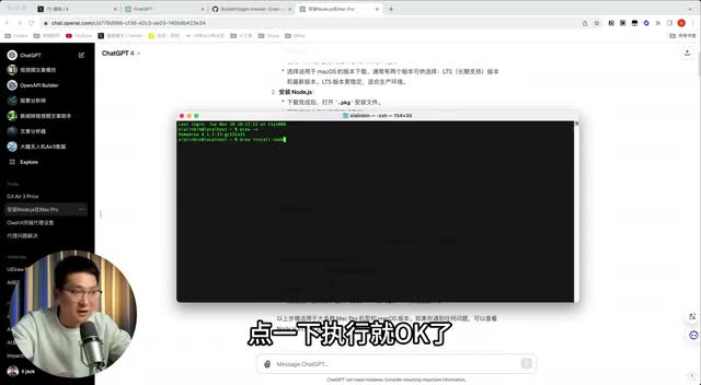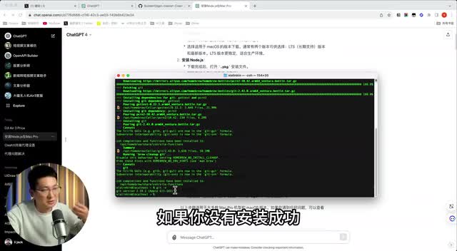 不管你会技术还是不会技术,用这个方法那基本上也是一键部署啊。首先呢它是要求我们在电脑上安装node点g s啊,并且这个版本号是大于等于十六的。除此以外呢,我们还要安装一个get指指令啊,就是我们我们可以通过这个gate指令去获取这个项目的源码啊,这样安装这两个就好了。那如果是说你不会安装note g s以及git啊怎么办呢?其实这里教大家一个非常非常简单的办法啊,就是我们打开h t g p t啊,问chat g p t基于你的电脑环境应该如何安装note g s啊,以及如何去安装git指令啊,o k这里呢是g p t。给我解决方案啊,因为我是mac o s的电脑,它是建议我先安装这个home。meaning啊homebrew的作用呢它相当于就是linux系统或者是mac o s系统的一个包管理器啊,可以简化我们在苹果电脑上安装更新或者管理软件啊。但是这里要注意一下啊,windows啊它是不能安装这个homebrew n啊,这个仅仅是局限于苹果电脑。