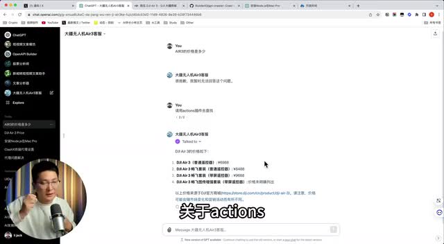 我们还是以这个大疆无人机l三客服的这个g p s作为一个示例啊啊比如说呢我来问他一个在知识库当中找不到答案的问题,那么正常情况下呢它肯定是作答不出来的啊,包括像我在这个panel里面里面有注释啊啊如果你。在知识库当中找不到答案啊,请回答。很抱歉,我暂时无法回答这个问题,但是呢别急,我有办法。这里呢我们可以去结合g b t s的action功能啊,让他来实现去自由的获取任意网站上的数据。这样的话呢我们既能通过这个action功能去获取联网数据啊,然后又有这个知识库的离线数据啊,等于两者都有了。h i g p t呢它既能回答知识库当中有的问题啊,又能回答知识库当中没有的问题。好,接下来我们来演示一下啊,我来问他a二三的价格是多少啊?那么这个问题呢在知识库当中啊,他是找不到答案的。