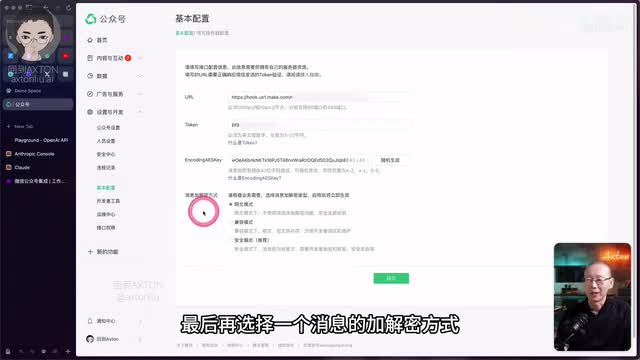 咱们这里说的你的服务器呢指的就是mac啊,因此呢这个服务器这边的u l呢实际上就是mac这边。你的监视消息的这个u i了。那接下来呢就输入token以及一个消息加密的密钥就可以了。最后再选择一个消息的加解密方式。那为了简单起见呢,我们就选明文模式最后提交。那提交之后呢,这边的按钮应该是一个启用。你只要点击它,你的服务器配置就可以正常启用。你就可以在mac这边用到监视消息的这些模块了。