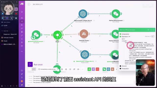 但是我并没有收到微信的回复消息。这就是因为我之前说过的呀,我是个人号,没有发送消息的权限,我所有的呢只是在五秒钟之内回复消息的权限。刚才大家也可以看到assistant的调用的时间显然超过了五秒钟。那我们可以在这边查看一下微信模块,它是不是得到了assistant,就是我的助手给出的正确的响应。好,我们可以看到这个微信模块实际上已经得到了前面assistant a p i的回复。cos在视频标题中有两期涉及,分别是免费的g t四travel香不香?然后逆天cos可免费用twitter a p i,这确实没有错,都是正确的。因此如果你的公众号有更高的权限呢,那么这些功能流程你就都可以用到了。好,至此啊make整合a i跟微信公众号的核心的流程功能就给大家介绍完了。