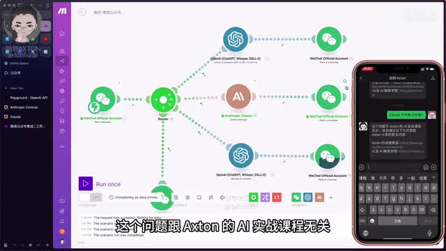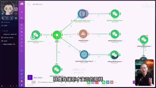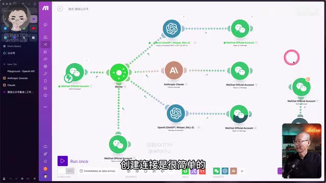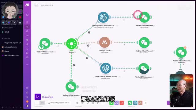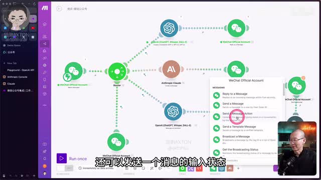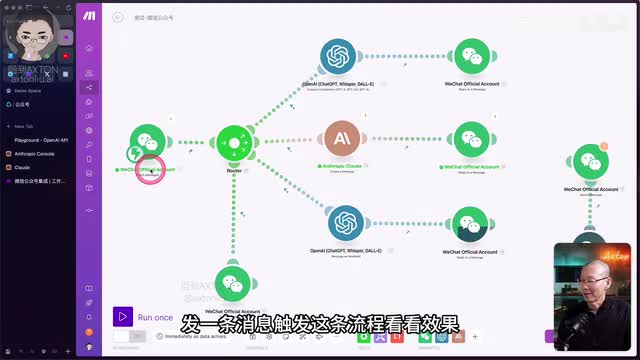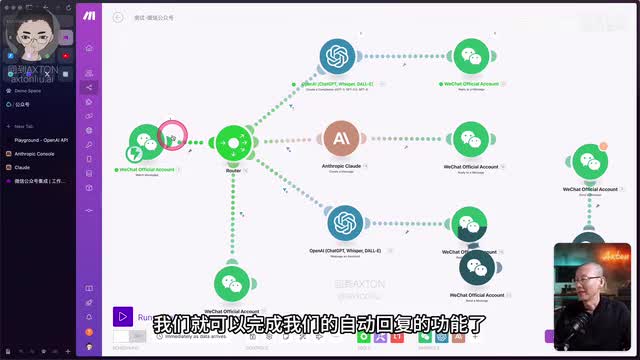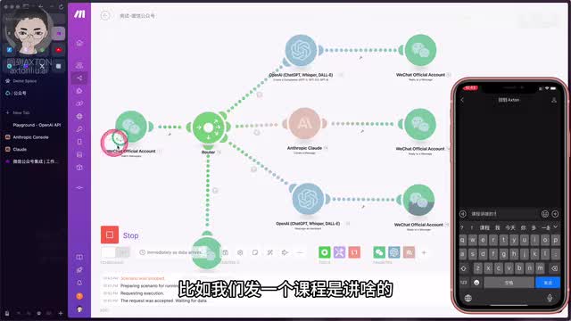 首先呢我们来看一个简单的演示,以及mac呢它都集成了微信公众号的哪些功能。这边就是微信公众号的模块,目前使用的功能呢是监视信息。当有新信息来的时候呢,就会触发进行下一步的动作。那这条路线呢就是首先把信息送给chat g p t。让他去判断问题是不是跟我的课程相关。然后给出不同的回答。所以最后这个模块呢用的就是微信的回复一条消息的功能。好,我们先把它运行起来,发条消息看一下。