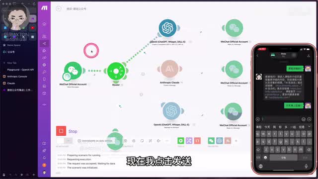 大家可以直观的从mac的工作流上呢看到它的运行过程。好,我们先回到手机上,进入到我的公众号。好,这边就是我的公众号,回到x的。目前呢并没有太多的功能,不过大家可以先关注着,今年很快就准备同步文章了。然后呢我们点发消息,比如我们发一个课程是讲啥的,目前这个模块的运行状态呢就是在等待消息的来临。当消息收到之后呢,大家可以注意这个工作流上面的变化,它就会标识出整个工作流的一个运行路线来。好,现在我开始准备点击发送按钮,收到消息送给chat g p t,然后给微信回复。那这边呢我们就可以看到这边已经回复了消息。