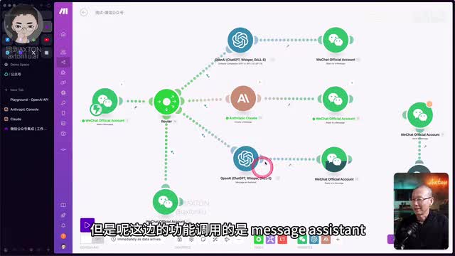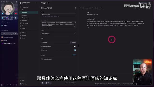 g p t三点五就是严肃的有板有眼的给你回复,cloud呢就显得更喜欢说话一些。好,接下来我们来看根据知识库来回答问题,回答用户的提问。mac呢它可以直接通过open ai的assistance a p i来调用g p t建立的知识库。或者说呢就是assistant助手。注意这里下面的这个流程和上面的这个流程,这两个g p t模块看起来长得一模一样,但是呢这边的功能调用的是message,嗯,assistant你给助手发信息,所以呢我们可以看到这里面调用的实际上是open a的assistant,并不是像之前这个一样给他发一个chat message chat prompt。好,现在我们来到open i d playground。比如我在这边就建立了一个演示的ai助手,它的名字就是x的内容助手,那它的目的就是问他某一项内容在我的哪期视频当中讲过。比如我们问他。
