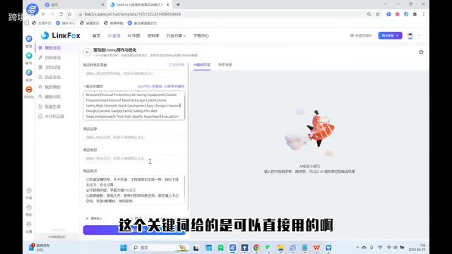 那么它自动生成的这些。这个关键词生成了之后,下面好像刚刚是有要导入关键词o k那是不是在这里了?然后商品品牌没有不写,有的话把自己品牌写进去,商品类目不填就没有然后商品的卖点啊,输入商品的卖点,我测试一下啊,我这个产品的卖点呢就是五点测试一下。