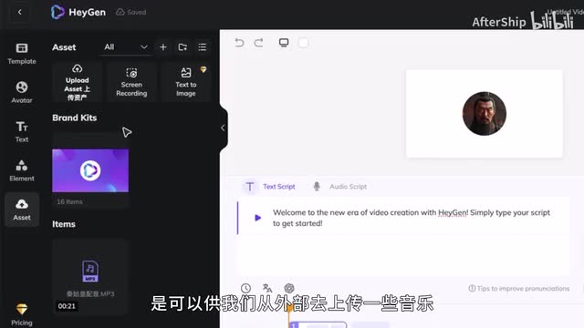 第四个的话是元素,比如说可以上传一些按钮、logo、图片,以及说插一些其他视频或者一些音乐等等。最后一个是资产词,是可以供我们从外部去上传一些音乐或者音频等等。然后这就是它左边的一个布局。然后我们来看一下它右边的一个布局。最上面呢它是一个视频的预览框,然后中间呢是一个文案的脚本。