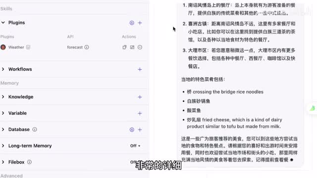 创建完之后,我们就直接点击加号,把这个文档添加到我们bt的知识库里面去。这个时候我们还要稍微的改一下prompt,让它来使用我们上传的知识库文档去回答关于餐厅的问题。我们接下来测试一下,它是不是真的能够使用我们上传的知识库来回答。比如说文档中提到大理最好的餐厅是集中在古城的护国路上,并且给我们推荐了几家餐厅的名字。那我们就用这个问题作为一个例子,去测试一下bot现在的回答是否跟文档里的一致。ok那我们可以看到bot给我们的回答是符合预期的。