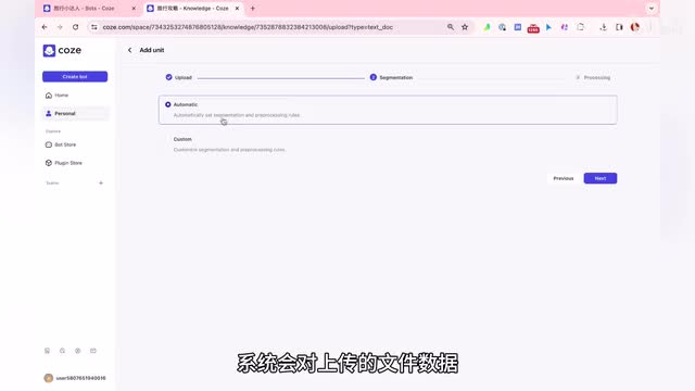 下面我就演示一下本地上传一个p d f类型的文档。好了,那么第一步文档上传成功了。然后第二步这里是让我们去选择一个内容的分割方式。automatic的意思就是系统会对上传的文件数据进行一个自动的分段,按照它系统默认的预处理规则来处理数据。custom的话也就是你可以手动的去设置分段的规则和预处理的规则。这个配置的意义是你可以选择更合适的分段方式,便于大语言模型能够检索出最相关的内容来回答用户问题。