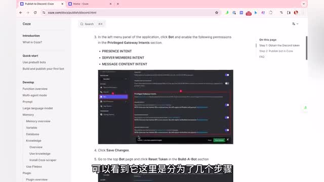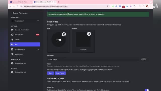 现在就会进入到application的一个配置页面,直接点左边的bot菜单。根据之前文档上的指引,我们把这里的三个开关给它打开,然后保存配置。然后我们再选择重新生成token。接下来把生成好的token copy一下。然后就开始返回到我们刚才的一个publish的页面。再再次点击config按钮,把我们生成好的token填写并保存。